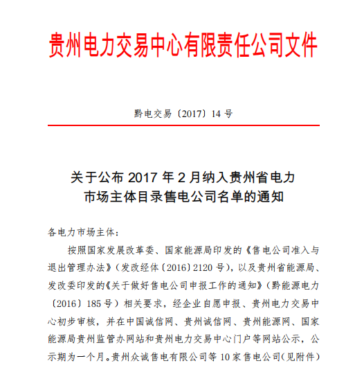 关于公布 2017 年 2 月纳入贵州省电力 市场主体目录售电公司名单的通知