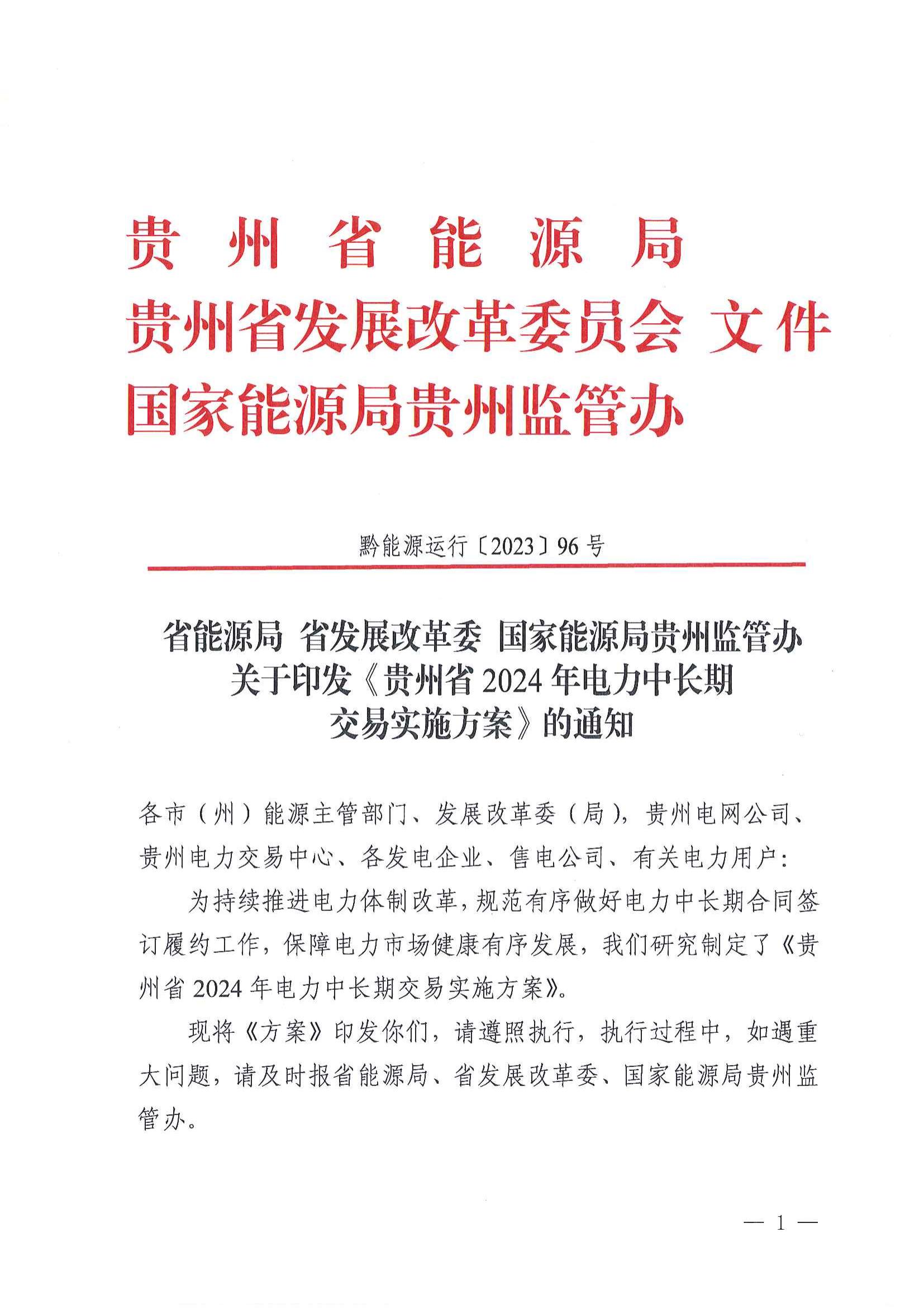 《贵州省2024年电力中长期交易实施方案》的通知(黔能源运行〔2023〕96号)
